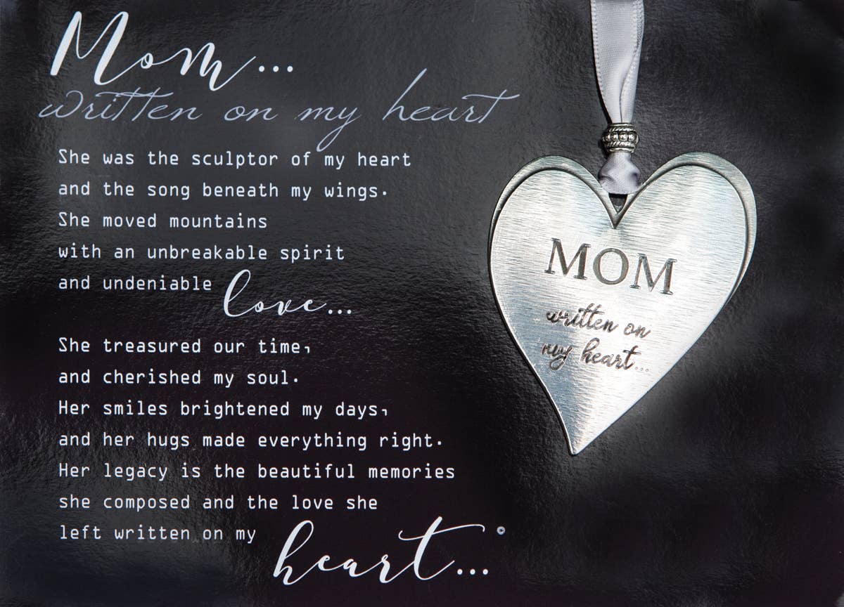 The words, "Mom...written on my heart" are engraved on the front of the heart. There is plenty of room on the back or front for additional engraving. The pewter heart is packaged with a comforting sentiment about the loss of a mother, beautifully written by company owner, Teri Harrison. The sentiment is printed on quality paper and is gift boxed with the heart.